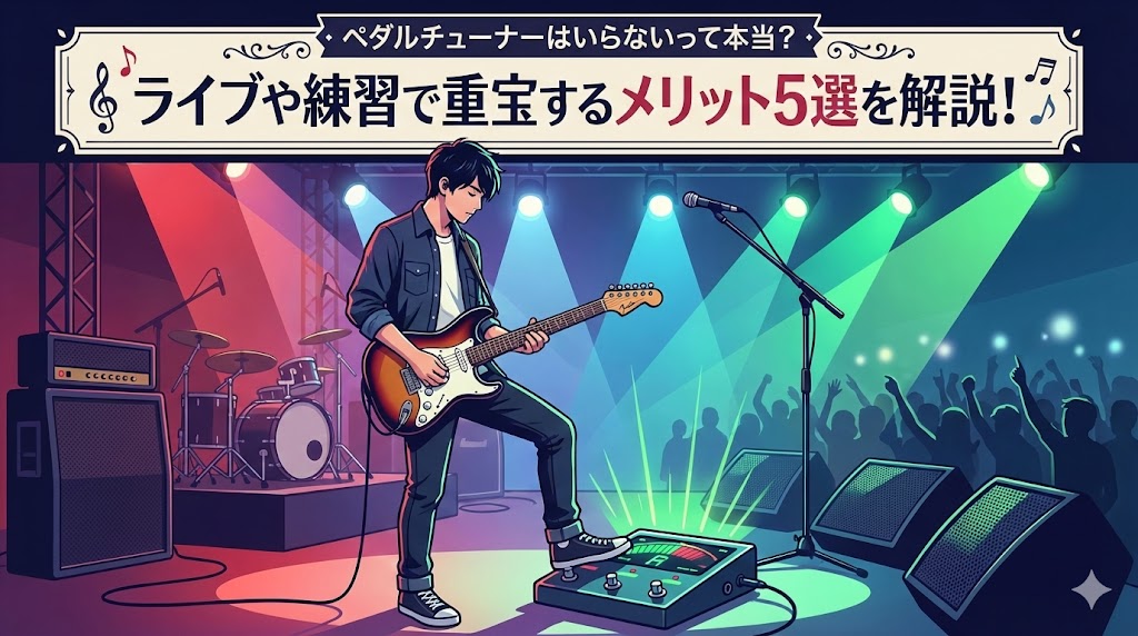 ライブ中に一番怖いのは、チューニングがズレたまま演奏を続けてしまうこと。そして、チューニング中の「ポロローン」という音が客席に丸聞こえになってしまうことです。ペダルチューナーは単なる測定器ではなく、ライブを円滑に進めるための「スイッチ」としての役割を担っています。